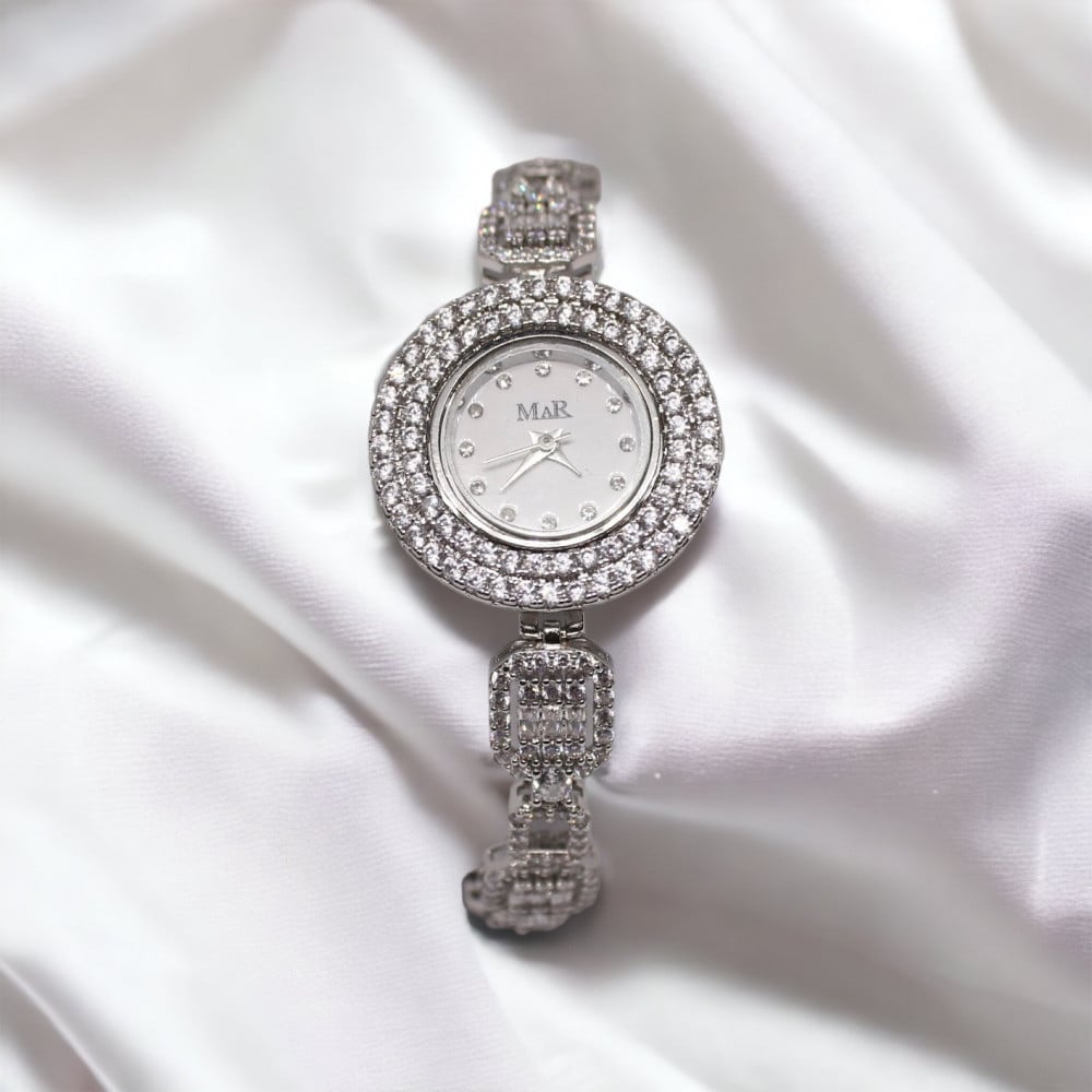 تفاصيل وصف الساعة :تتميز الساعة بفصوص الزركون البراقه لتبرز جمال الساعة .ساعة تناسب الافراح والمناسبات.جودة ولمعة ممتازه مع ضمان سنة على اللون فقط . توصيل سريع على جميع مدن المملكة.